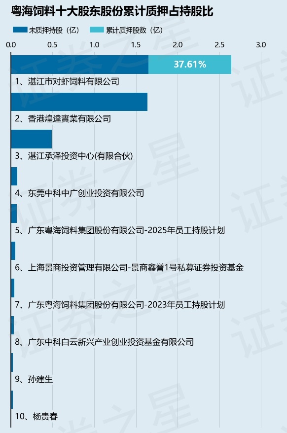截止本公告日,股东湛江市对虾饲料有限公司已累计质押股份9951.0万股,占其持股总数的37.61%。本次质押后粤海饲料十大股东的累计质押股份占持股份额(占持股份额的核算以公司最新一期财务报表发布的十大股东的持股总数为基准)见下图: