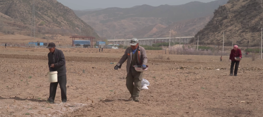 一小时三十九分的影片,绝大多数画面只有地里的作物和在土地上耕种的人。比如撒肥料,镜头拍摄了各家装肥的用具:有的用盆,有的用桶,有的在肩膀套上两根绳将竹筐固定在胸前,有的直接把化肥袋子做成单肩包。同样是耕地,地势高处,一名老人紧握犁把,赶骡子前进;地势平坦处,则变成耕地机轰隆隆驶入。