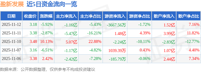 证券之星音讯,到2025年11月12日收盘,盈新发展(000620)报收于3.18元,跌落5.92%,换手率14.14%,成交量660.52万手,成交额21.28亿元。